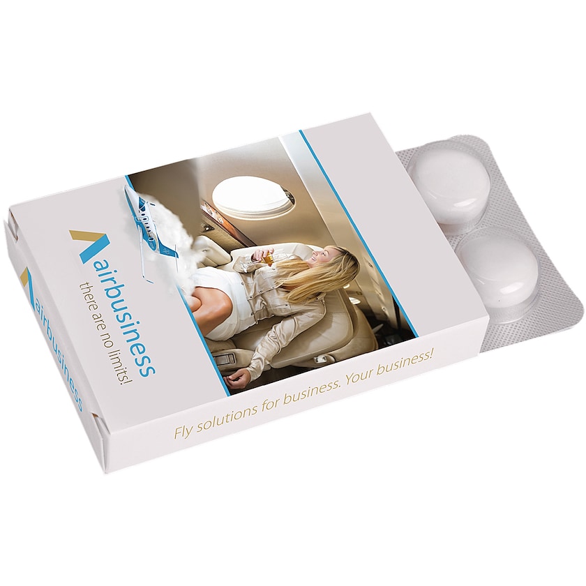 Boîte en carton personnalisée par impression en quadrichromie contenant 6 pastilles à la menthe sous emballage blister. Les pastilles sont molles et masticables.
