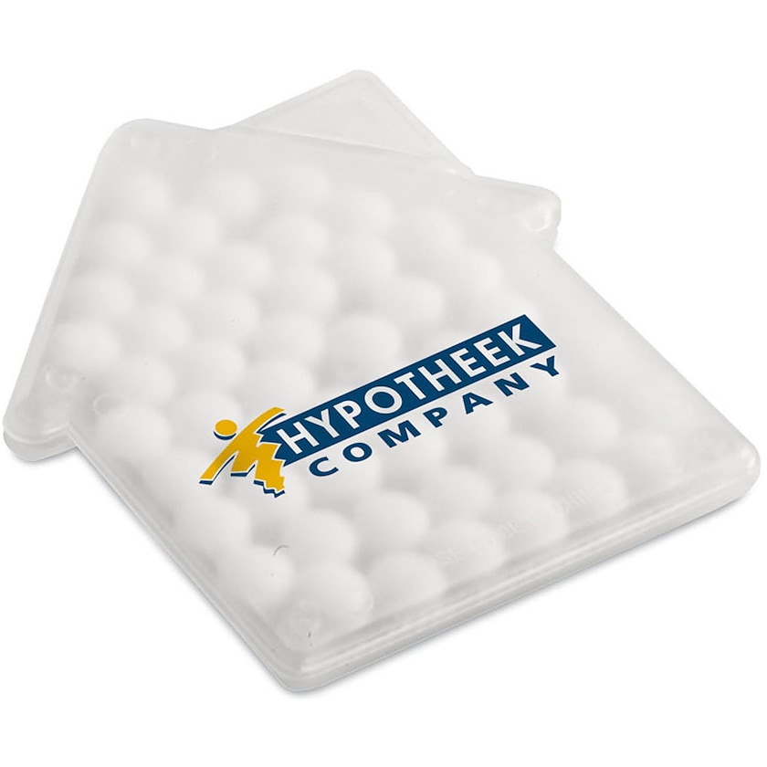 Distributeur de bonbons fun en forme de maison ayant l'épaisseur d'une carte de crédit et contenant environ 50 pastilles à la menthe sans sucre.