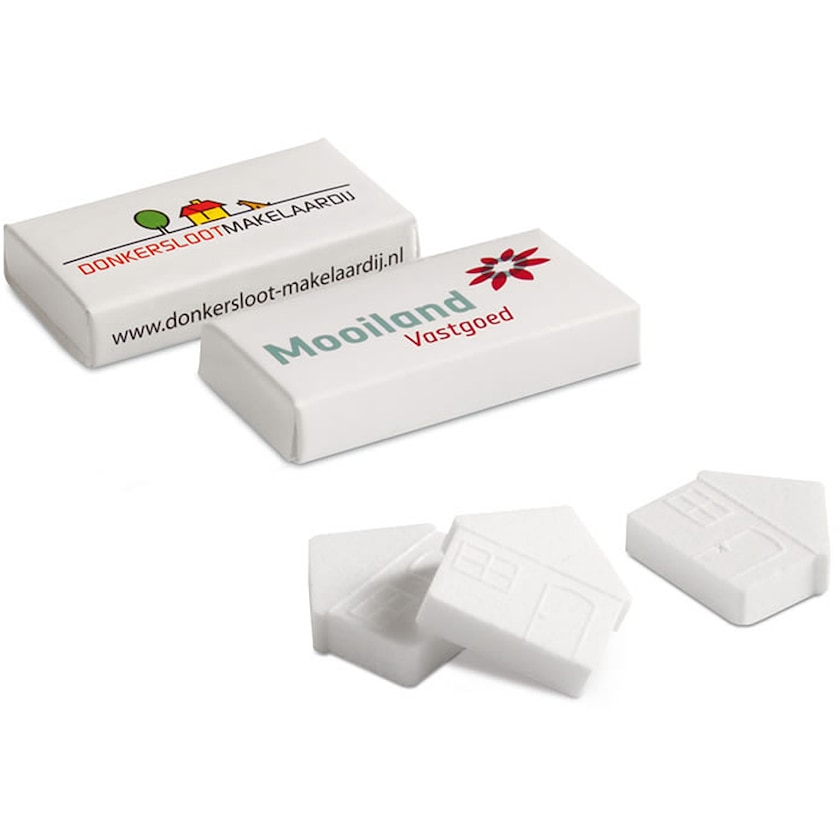 Mini boîte contenant deux bonbons à la menthe rafraîchissants en forme de maison. Parfait pour tous ceux qui travaillent dans l'immobilier!