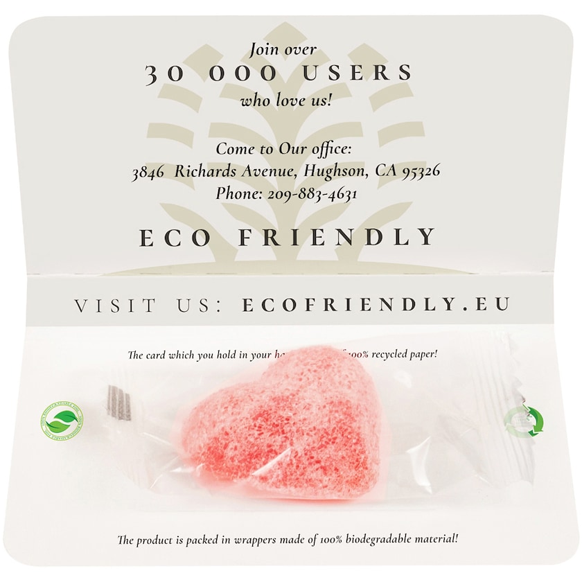 Un cœur en gelée fixé sur une carte en carton. L'emballage du cœur en gelée est 100% biodégradable. La carte en carton est perforée de façon à pouvoir être facilement détachée et utilisée en coupon promo par exemple.