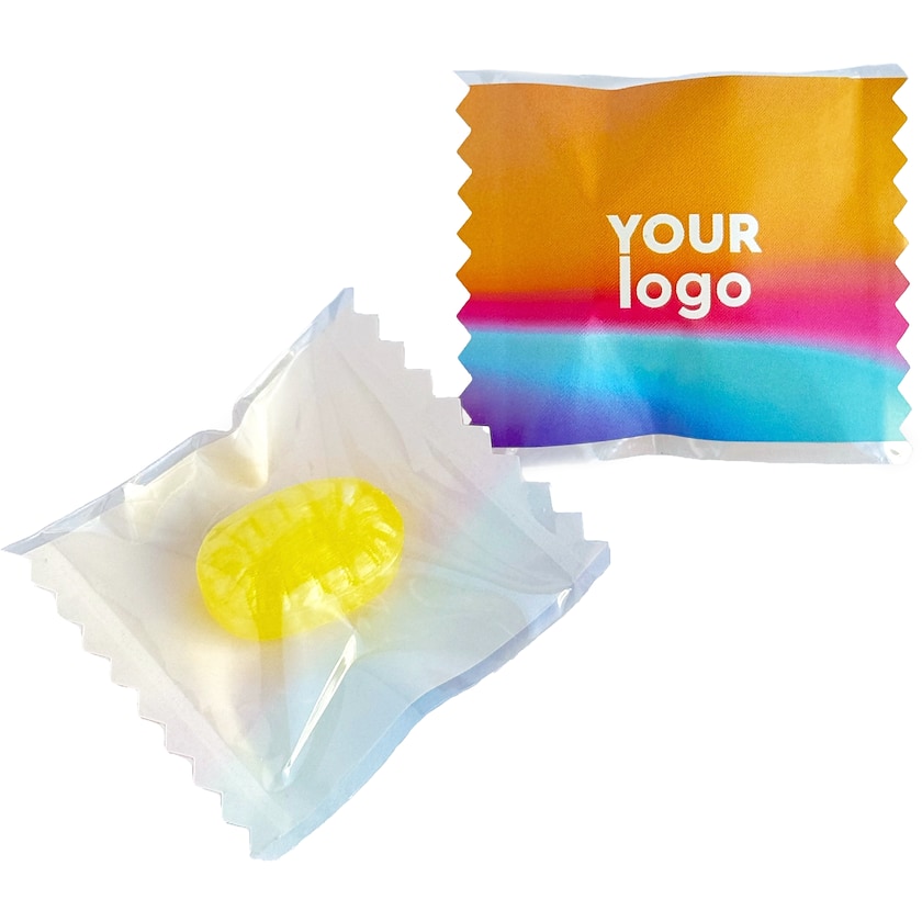 Caramels sans sucre avec propre impression. Chaque caramel est conditionné dans un flow-pack avec votre impression sur le dessus. Choisissez entre les saveurs mélange d'agrumes et menthol.
