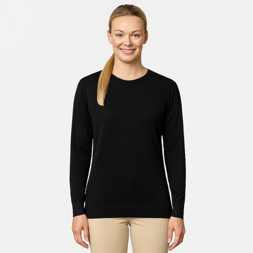 Pull femme finement tricoté à col rond. Le pull est fabriqué dans un tissu agréablement doux composé à 80% de viscose et à 20% de nylon. La personnalisation est réalisée par broderie.