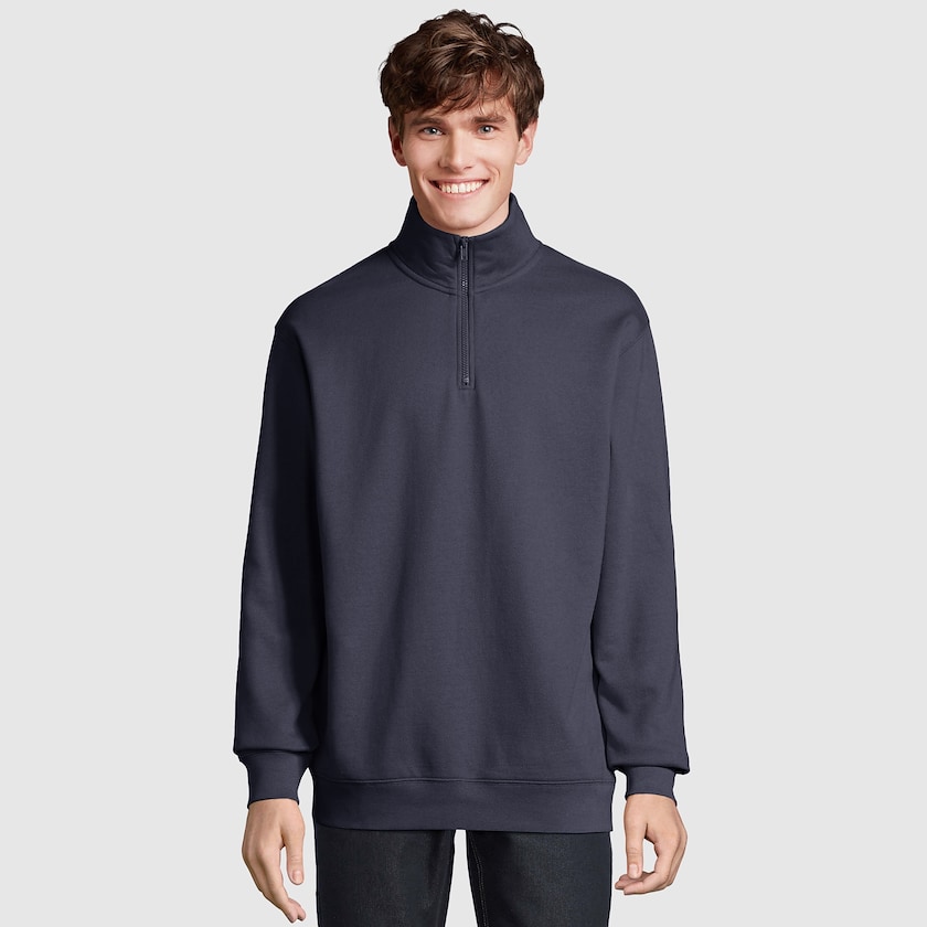 Sweat-shirt de French SOL's avec une courte fermeture éclair dans le cou. Le tissu est composé à 80 % de coton et à 20 % de polyester recyclé certifié GRS. L'exception est la couleur gris mélangé, composée de 73 % de coton, 20 % de polyester recyclé et 7 % de viscose.
