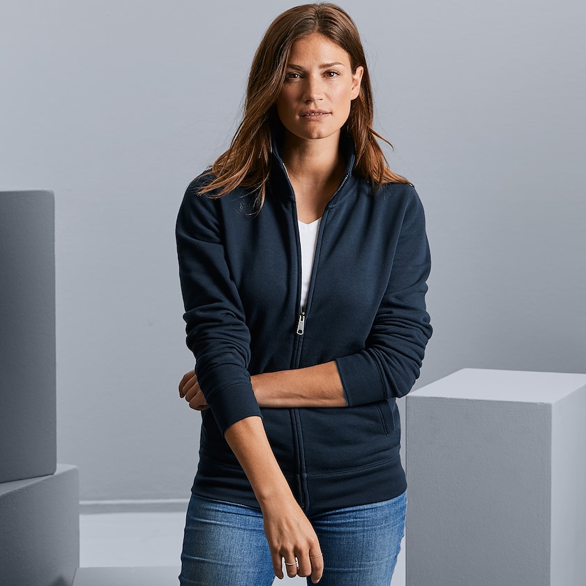Sweat avec longue fermeture éclair et coupe droite. Le sweat a des poches latérales. La personnalisation est réalisée par impression ou par broderie sur la poitrine, ou par impression dans le dos. Également disponible en version version homme.