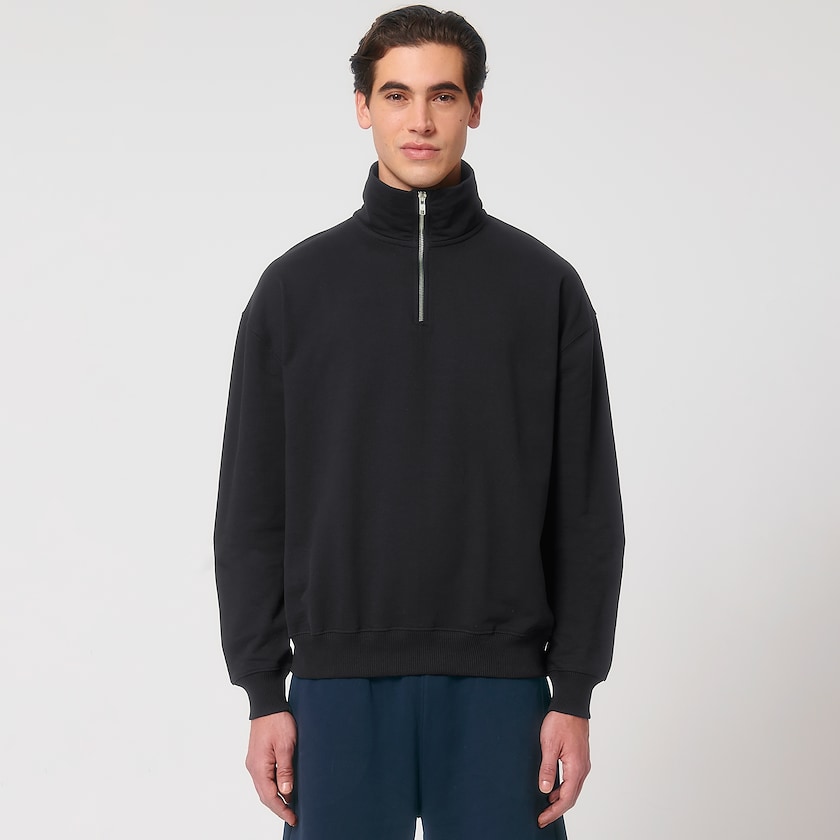Sweat à col haut avec fermeture éclair. Le sweat est de type set-in-sleeve et fabriqué en coton écologique. Disponible en plusieurs jolis coloris.