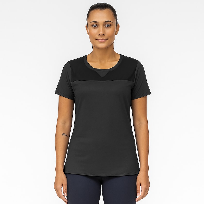 T-shirt sport femme en matériau recyclé. Le tissu est composé à 90% de polyester recyclé et à 10% d'élasthanne. Ce tissu est spécialement conçu pour le sport et vous garde au frais même pendant des séances de sport intensives. Également disponible en version version homme.