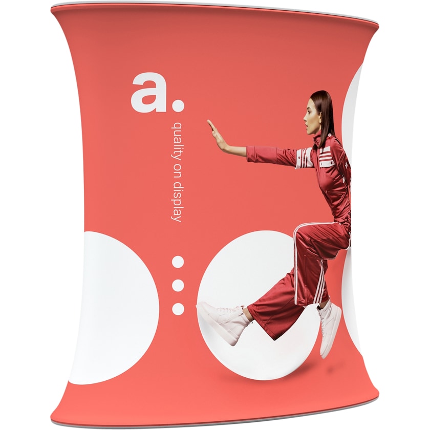 Table d'exposition stable et très flexible avec sa propre impression. Arc Oval a une structure robuste de tubes en aluminium recouverts de tissu polyester. Le plateau est en MDF. La table d'exposition s'assemble facilement grâce à l'ourlet en silicone du tissu qui se fixe au système, ce qui permet une construction sans couture. Si nécessaire, le tissu peut être commandé séparément afin que le motif de la table de salon puisse être renouvelé. Livré dans un sac de rangement astucieux.