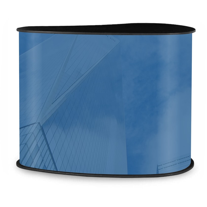 Grande table de salon courbée à montage rapide. L'Expo Large a une construction ingénieuse avec un plateau en bois et un fond en PVC recouvert de Velcro. L'impression se fait sur un film plastifié placé sur le dessous. Choisissez entre un laminage brillant ou mat. Sac inclus.