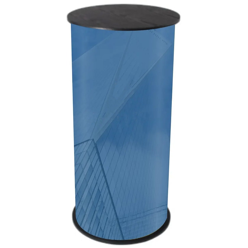 Table de salon ronde au format compact à petit prix. Expo Round se compose d'un plateau en bois et d'une partie inférieure en PVC recouvert de velcro. L'impression se fait sur un film laminé qui est placé sur tout le fond. Le film laminé peut être brillant ou mat. La table prend peu de place, ce qui en fait un bon choix lorsque l'espace au sol est limité. Sac inclus.