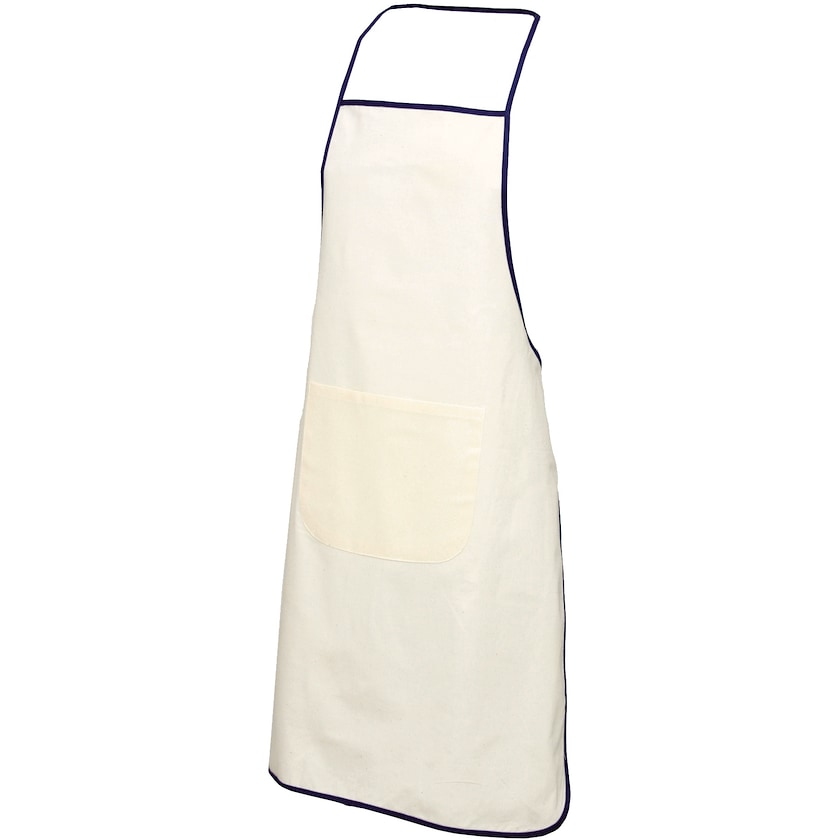 Tablier 100% coton de couleur naturelle. Les coins et l'attache du tablier sont de couleur contrastante. Le devant du tablier comporte une grande poche.