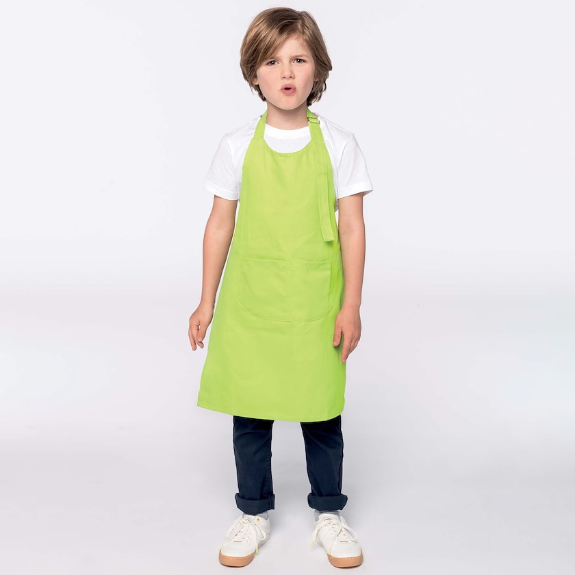 Tablier pour enfants en tissu coton résistant. Le tablier possède deux poches abdominales.