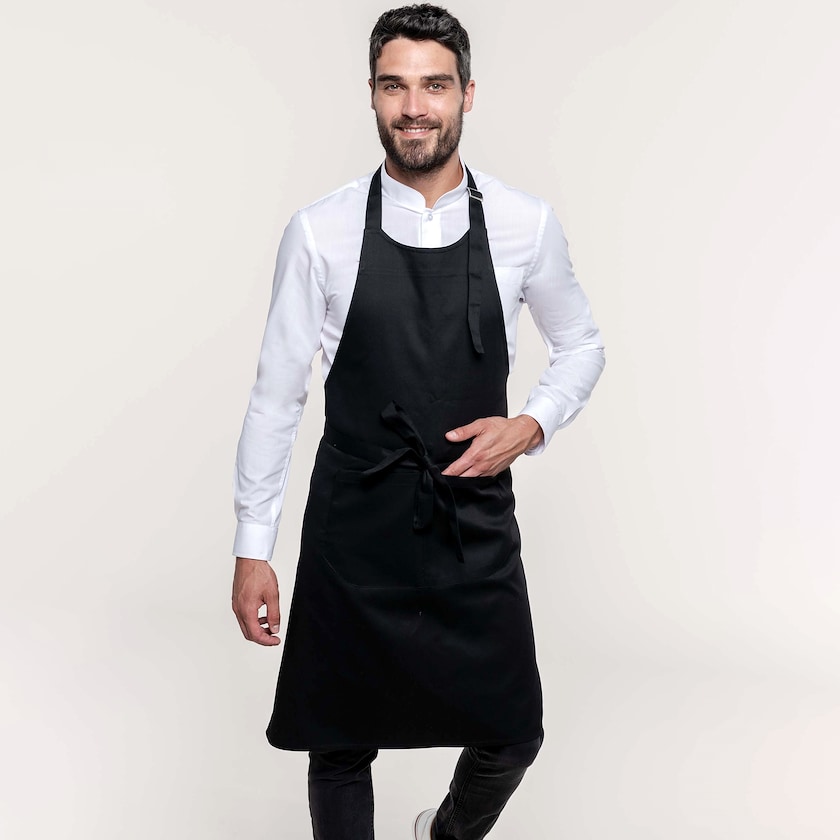 Tablier à usage professionnel lavable en machine. Le tablier est lavable en machine jusqu'à 60 degrés et lavable en machine industrielle jusqu'à 85 degrés suivant la norme ISO 15797. Sur le devant se trouve une grande poche avec deux compartiments. Le tablier fait 90 cm de long et 76 cm de large.