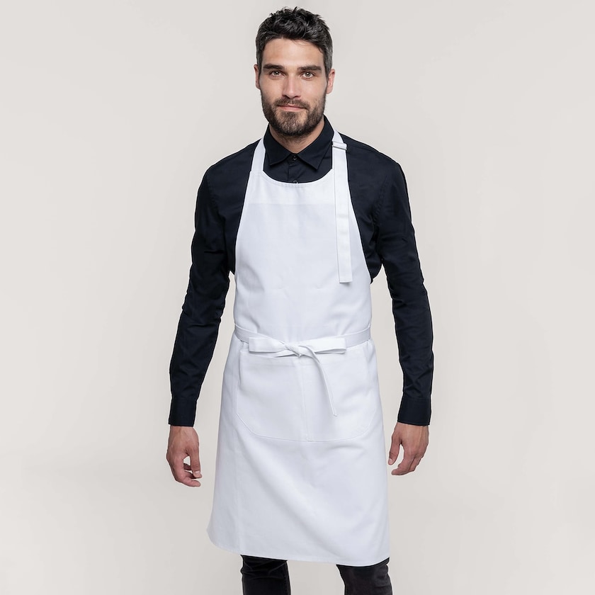 Tablier de haute qualité lavable en machine à haute température. Le tablier est lavable en machine jusqu'à 60 degrés et en machine industrielle jusqu'à 85 degrés suivant la norme ISO 15797. Sur le devant du tablier se trouve une grande poche avec deux compartiments. Le tablier fait 90 cm de long et 76 cm de large.