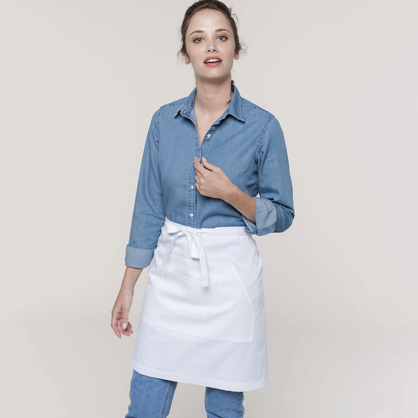 Tablier en tissu fait d'un mélange de polyester résistant. Sur le devant se trouve une grande poche ainsi qu'une poche plus petite divisée en deux compartiments. Le tablier fait 50 cm de long et 90 cm de large.