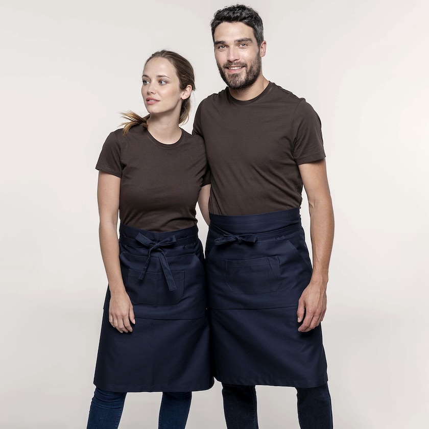Tablier court 100% coton avec deux poches. Le tablier fait 90 cm de long et 62,5 cm de large. Disponible en plusieurs jolies couleurs.