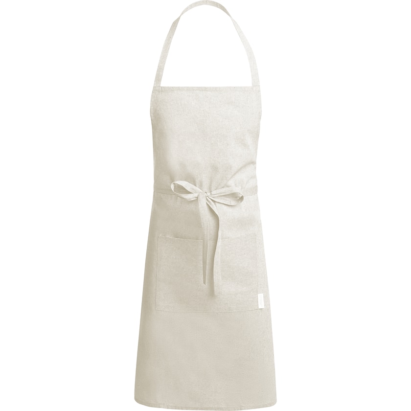 Long tablier personnalisable en coton 100% recyclé. Le devant du tablier propose une grande poche. Sur le tablier, une petite étiquette indique que le tablier est fabriqué en coton recyclé.