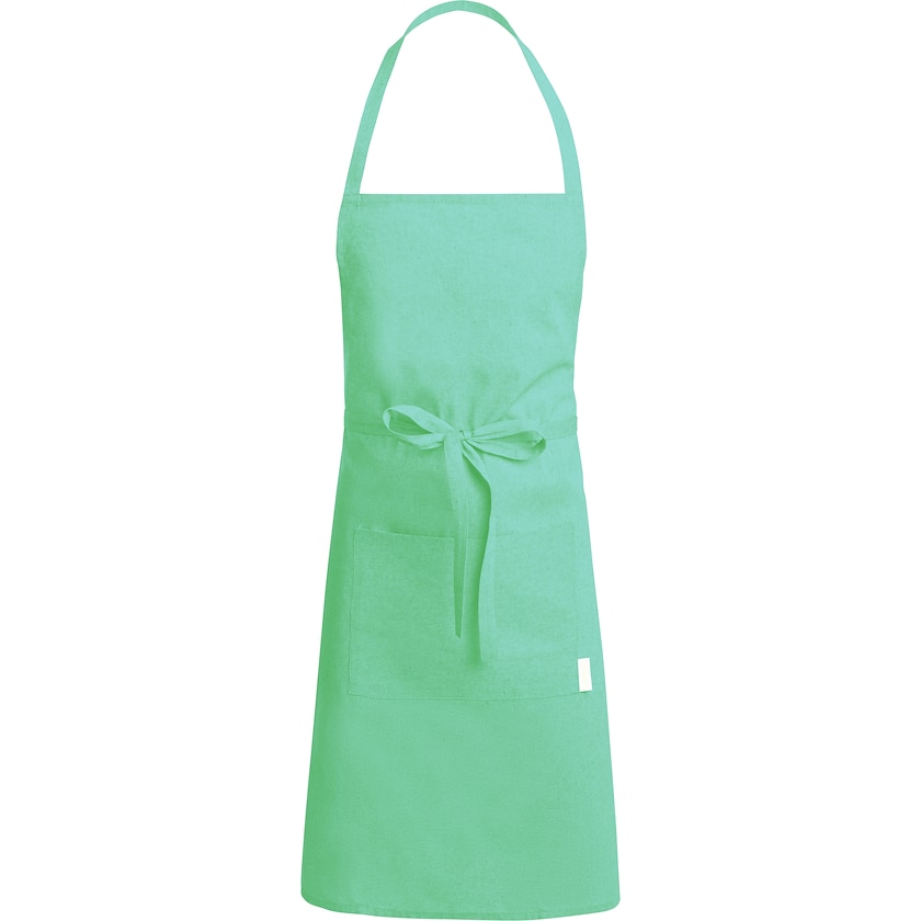Long tablier personnalisable en coton 100% recyclé. Le devant du tablier propose une grande poche. Sur le tablier, une petite étiquette indique que le tablier est fabriqué en coton recyclé.