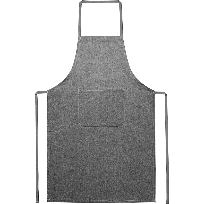 Tablier en coton recyclé. Le tablier possède une poche large sur l'estomac. Le tissu étant fabriqué à partir de matériaux recyclés, il est joliment chiné.