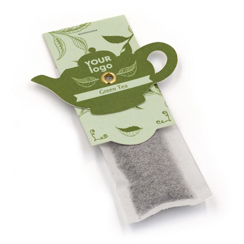 Sachet de thé avec une belle étiquette en papier avec votre impression. Choisissez entre quatre saveurs.