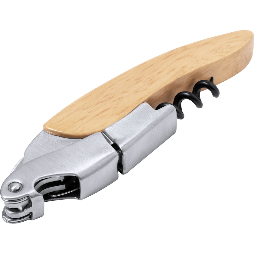 Tire-bouchon en acier inoxydable et bois clair. Le marquage peut être réalisé soit par gravure laser, soit par impression en deux couleurs maximum.