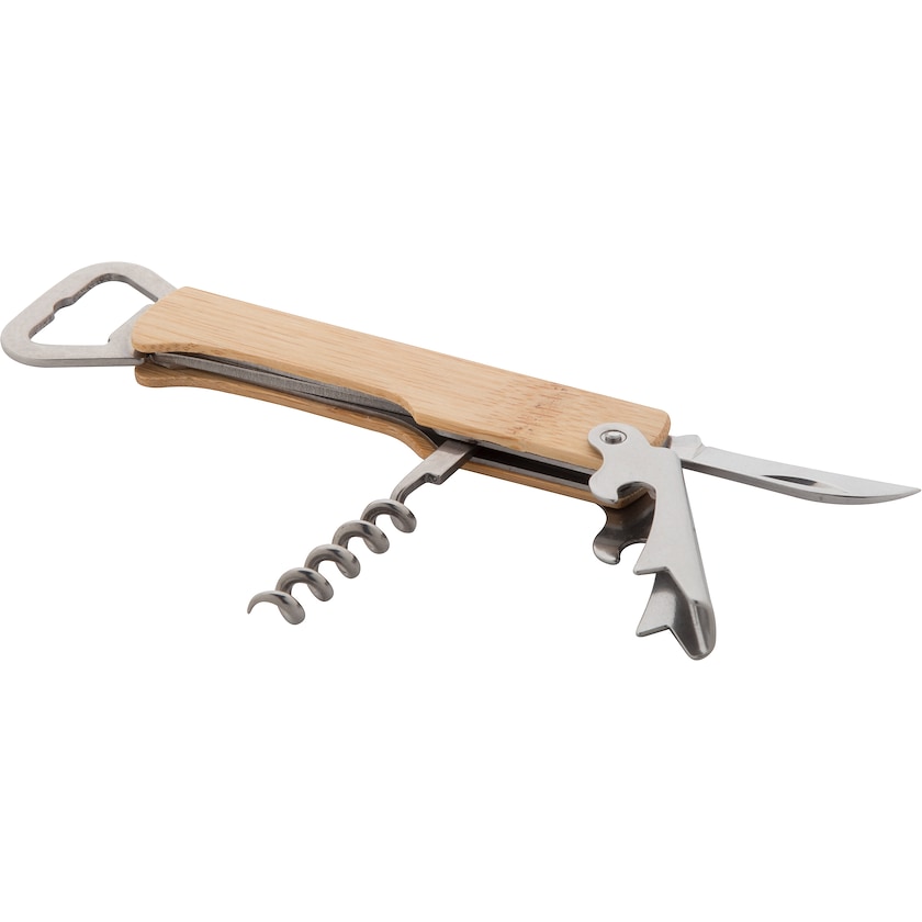 Tire-bouchon en acier inoxydable et bambou. Contient un tire-bouchon, un couteau et deux types de décapsuleur. Livré dans une boîte cadeau marron.