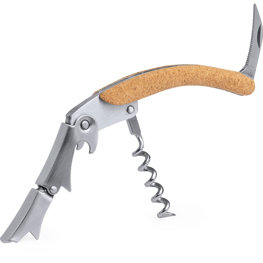 Tire-bouchon en acier inoxydable et liège. La personnalisation est réalisée par gravure laser. Un tire-bouchon exclusif au style unique.