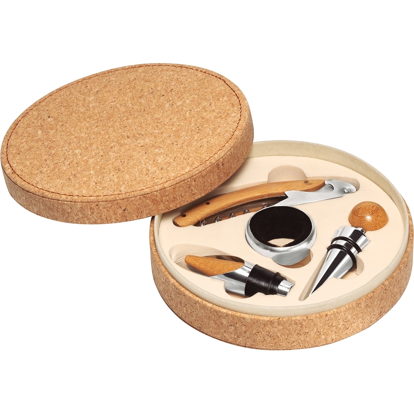 Coffret vin dans une jolie boîte en liège. Le coffret contient tout le nécessaire pour les vrais amateurs de vin. La personnalisation est réalisée par impression ou par gravure laser sur la boîte.