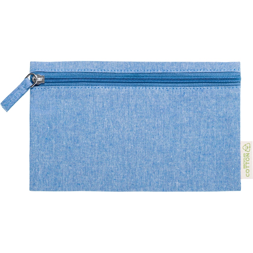 Trousse à maquillage en coton 100% recyclé. Une petite étiquette sur la trousse indique qu'elle est fabriquée uniquement en coton recyclé. Une trousse à maquillage au prix attractif et bonne pour l'environnement.