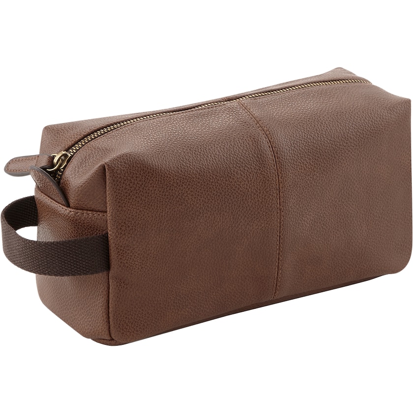 Trousse de toilette haut de gamme en cuir synthétique. L'intérieure de la trousse de toilette est habillé d'un tissu à rayures facile à nettoyer. À l'intérieur, des poches permettent de ranger de petits accessoires. La trousse de toilette possède une contenance de 3 litres.