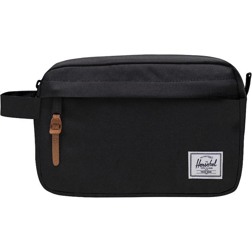 Trousse de toilette écologique de la marque américaine Herschel. Le tissu est composé à 100 % de polyester recyclé. L'intérieur comporte une poche en filet pour les petits objets.