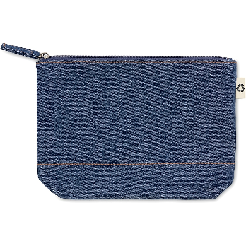Trousse de toilette en tissu denim. L'Edmonds est équipée d'une fermeture éclair et fabriquée à 50% en denim recyclé et à 50% en coton. Une trousse de toilette tendance en matériau recyclé.