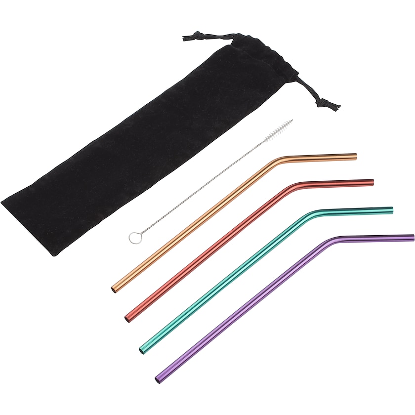 Set de quatre pailles en acier inoxydable. Chaque paille mesure Ø 6 x 220 mm. Livré dans un sac de rangement pratique en velours. L'impression est réalisée sur le sac. Une brosse pour paille est incluse.