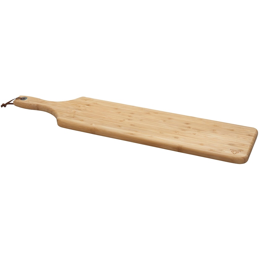 Planche à découper oblongue pouvant également servir de planche de service. La Saint-Leu est fabriquée dans un bambou à la fois et résistant, poli pour un nettoyage facile. L'anse est pourvue d'un cordon en cuir avec un anneau en métal.