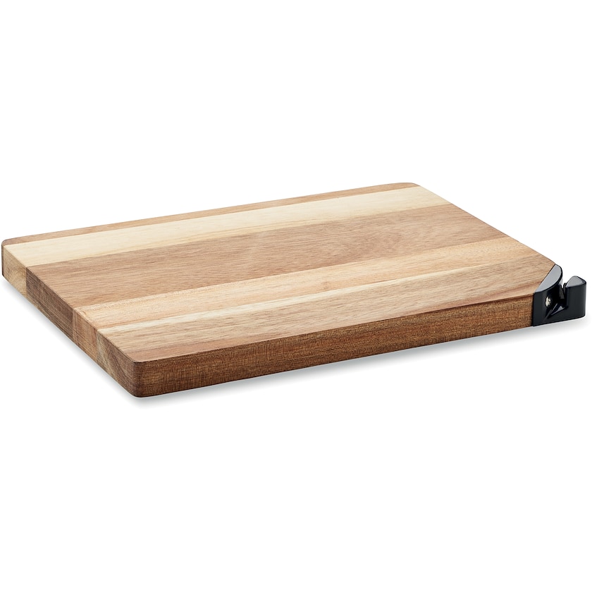 Une somptueuse planche à découper en bois d'acacia. Dans un coin se trouve un aiguiseur de couteaux très pratique. Un cadeau parfait pour les passionnés de cuisine.