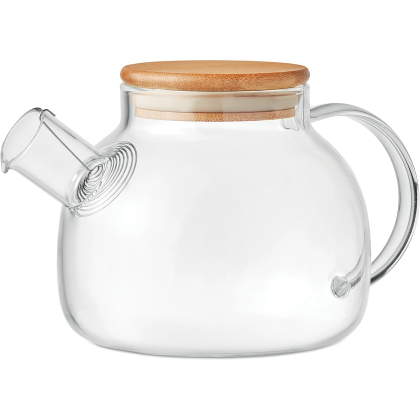 Jolie théière en verre avec couvercle en bambou. Le verre est de type borosilicaté, il est donc ignifugé et très résistant. La personnalisation peut être réalisée en deux couleurs maximum.