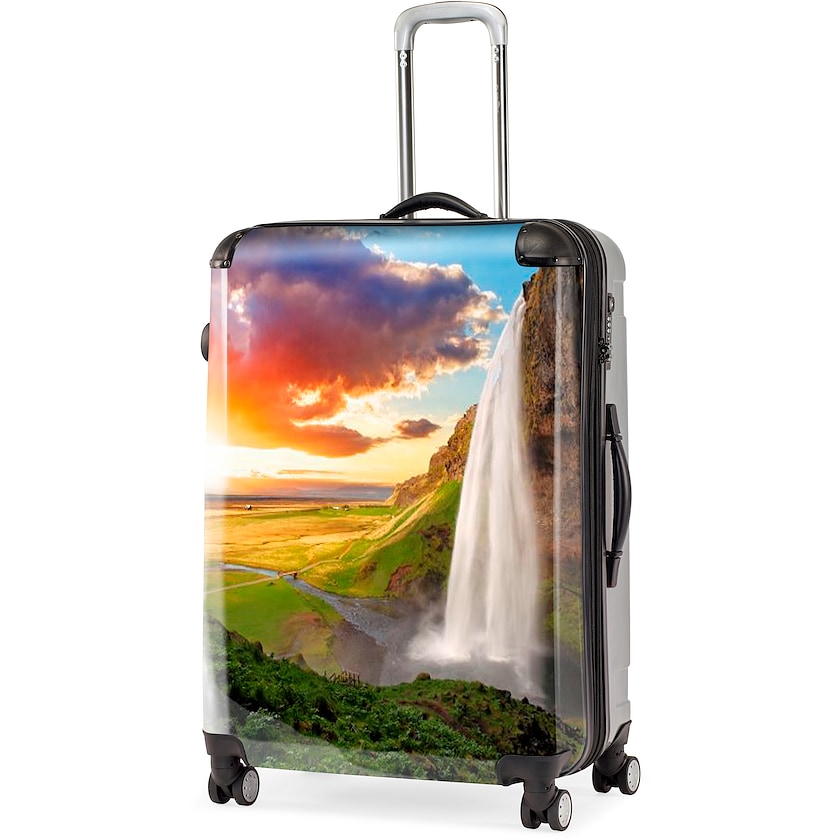 Grande valise avec impression sur toute la face avant. La Calro est fabriquée en polycarbonate, un matériau à la fois léger et anti-choc. La valise a 8 roues et un verrou TSA. À l'intérieur se trouvent des poches de rangement, des sangles de serrage et un sac à linge. La valise peut être agrandie jusqu'à 25%. L'impression est réalisée sur un papier photo placé derrière une surface transparente protectrice. La valise est livrée avec 2 ans de garantie.