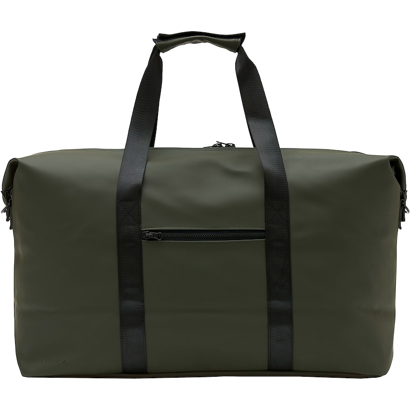 Grand sac week-end Vinga. Le sac possède un tissu imperméable et un design minimaliste. L'un des côtés abrite une poche à bouton pression, l'autre une poche à fermeture éclair. La bandoulière est réglable.