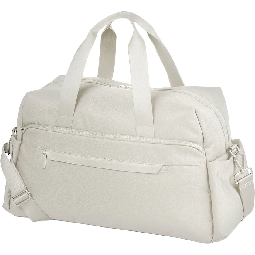 Sac de week-end au design minimaliste et de haute qualité. Une poche zippée est présente à l'avant pour les petits objets. À l'intérieur, trois poches plus petites accueillent les objets de valeur. La bandoulière est amovible. Le tissu est en polyester 600D recyclé.