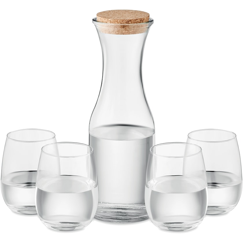 Set de quatre verre et une carafe. Le verre est fabriqué dans du verre recyclé et son bouchon est en liège. Le carafe possède une contenance de 100 cl et chaque verre contient 42 cl. Le prix de la personnalisation fait référence à celui de la personnalisation de l'un des verre ou de la carafe. La personnalisation sur le verre couvre 30 x 30 mm, 40 x 40 mm sur la carafe.