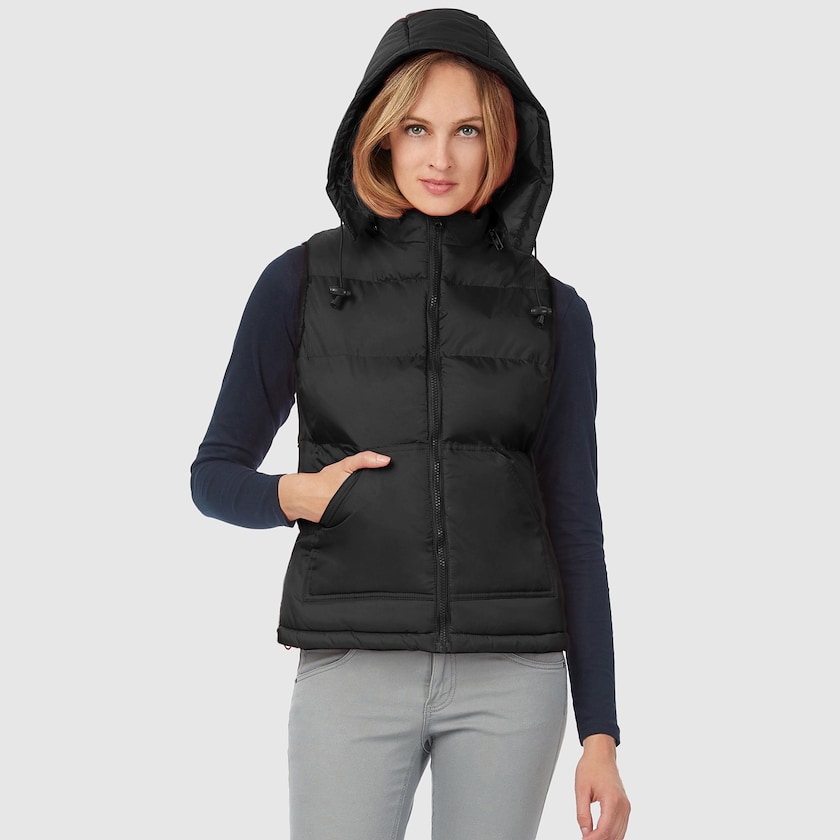 Veste en duvet B&C pour femme Cette veste en duvet possède deux poches avant et une capuche détachable avec fermeture éclair. Cette veste en duvet peut être personnalisée par impression ou par broderie. L'extérieur est en nylon et la doublure en polyester.