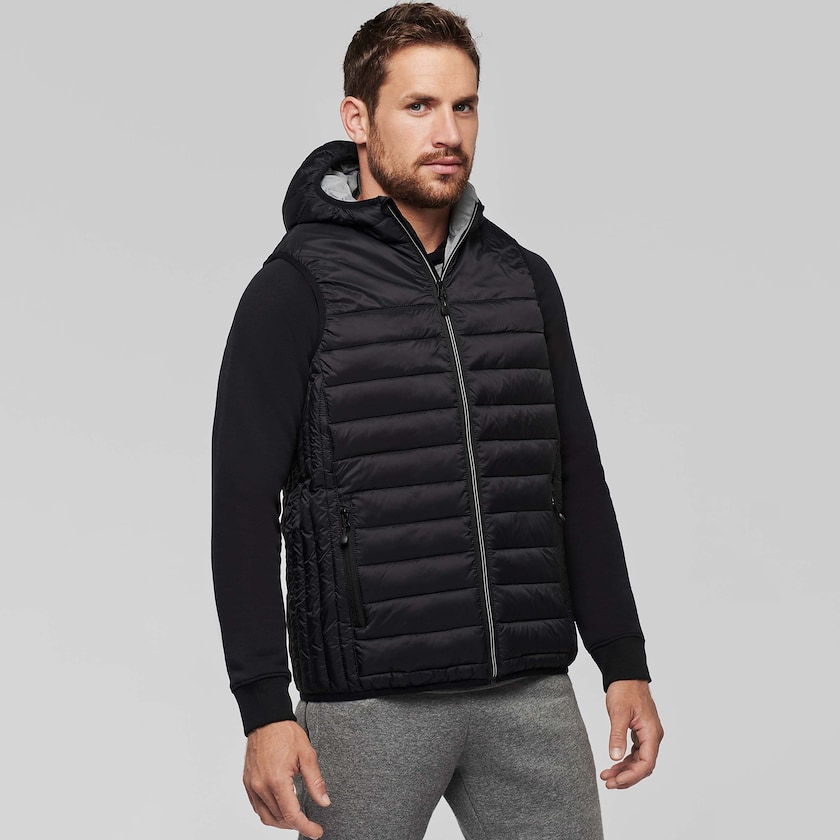 Veste sans manches haut de gamme avec capuche. La veste est ultra légère, mais chaude. Sur le devant se trouvent deux poches à fermeture éclair.