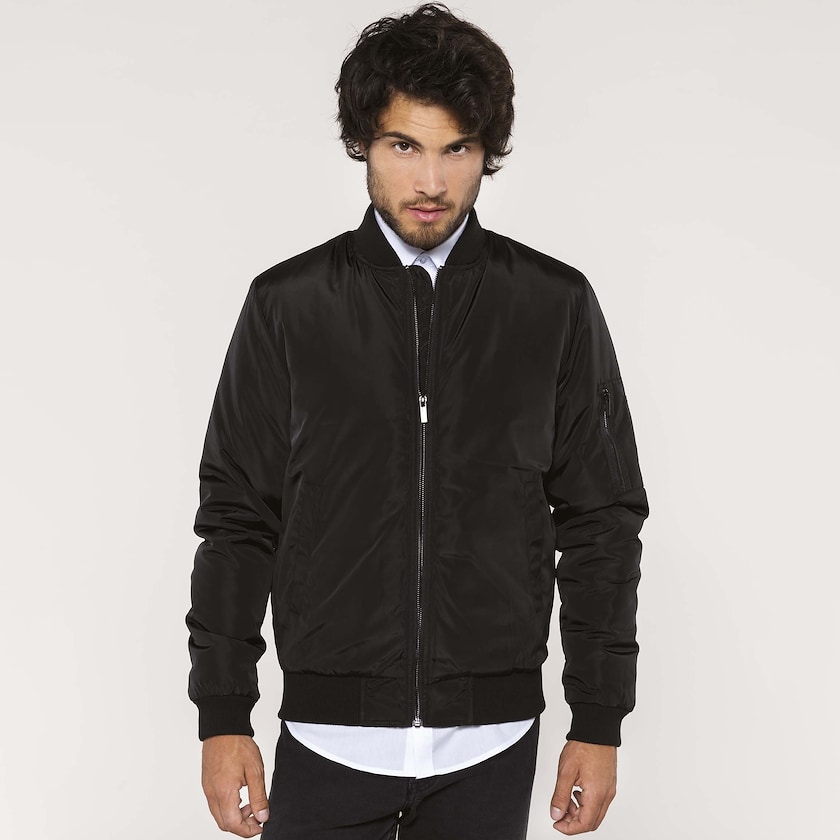 Veste bomber pour homme. La veste possède tous les attributs classiques avec deux poches latérales, une poche de manches et une poche intérieure. Commandez vos vestes bomber personnalisées chez Axon Profil! Également disponible en version version femme.