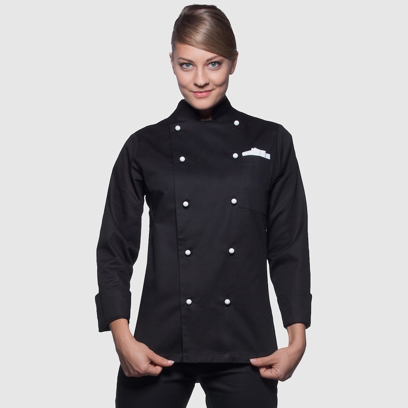 Veste de cuisine pour femme. La veste possède une coupe près du coupe et se ferme par 10 boutons (non inclus). La veste comporte une poche de poitrine sur la gauche. La veste de cuisine peut résister à un lavage industriel jusqu'à 95 degrés. Également disponible en version version homme.