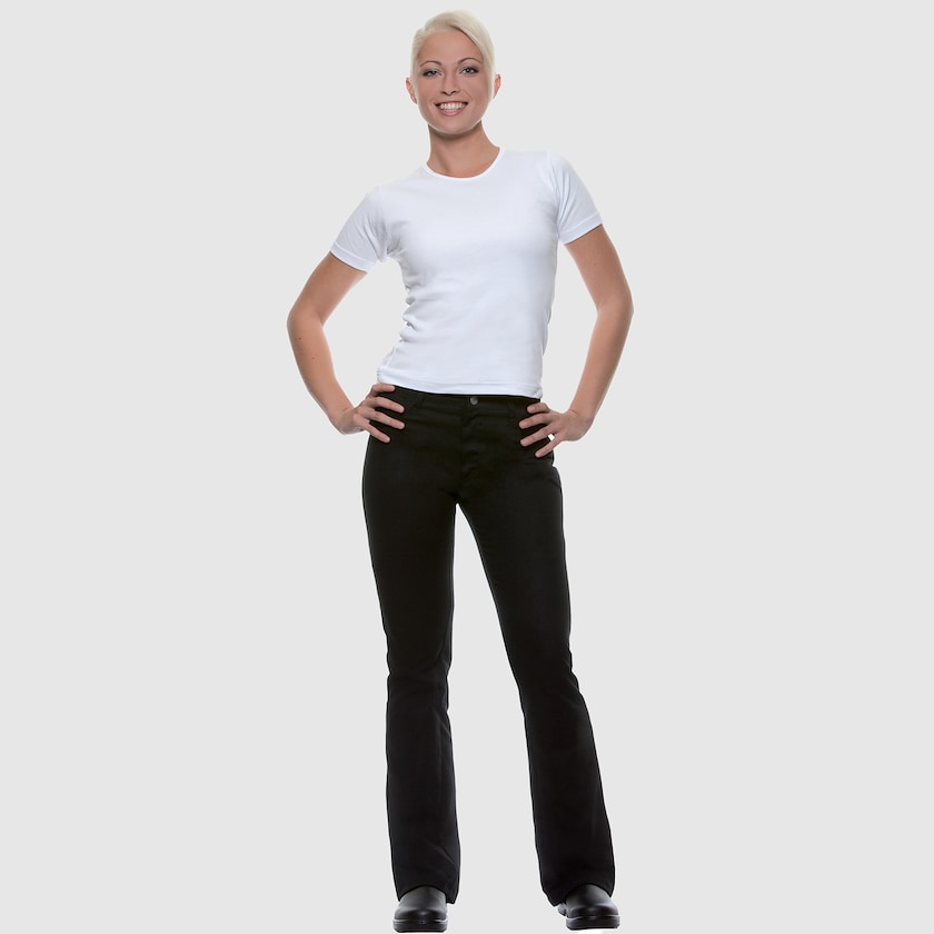 Pantalon de cuisine à 5 poches pour femme. Le tissu est de type easy care. Les pantalons blancs peuvent être lavés jusqu'à 95 degrés, les noirs jusqu'à 60 degrés. Ce modèle est également disponible en version homme.