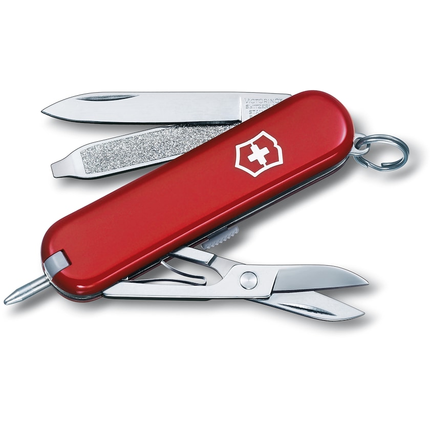Couteau de poche malin avec stylo à bile. Le Victorinox Signature possède les mêmes fonctions que le Classic, mise à part la lime à ongles, remplacée par un stylo bille. Comporte une petite lame de couteau, une paire de ciseaux, une lime à ongles avec tournevis, un stylo, une pince à épiler et un anneau porte-clé.